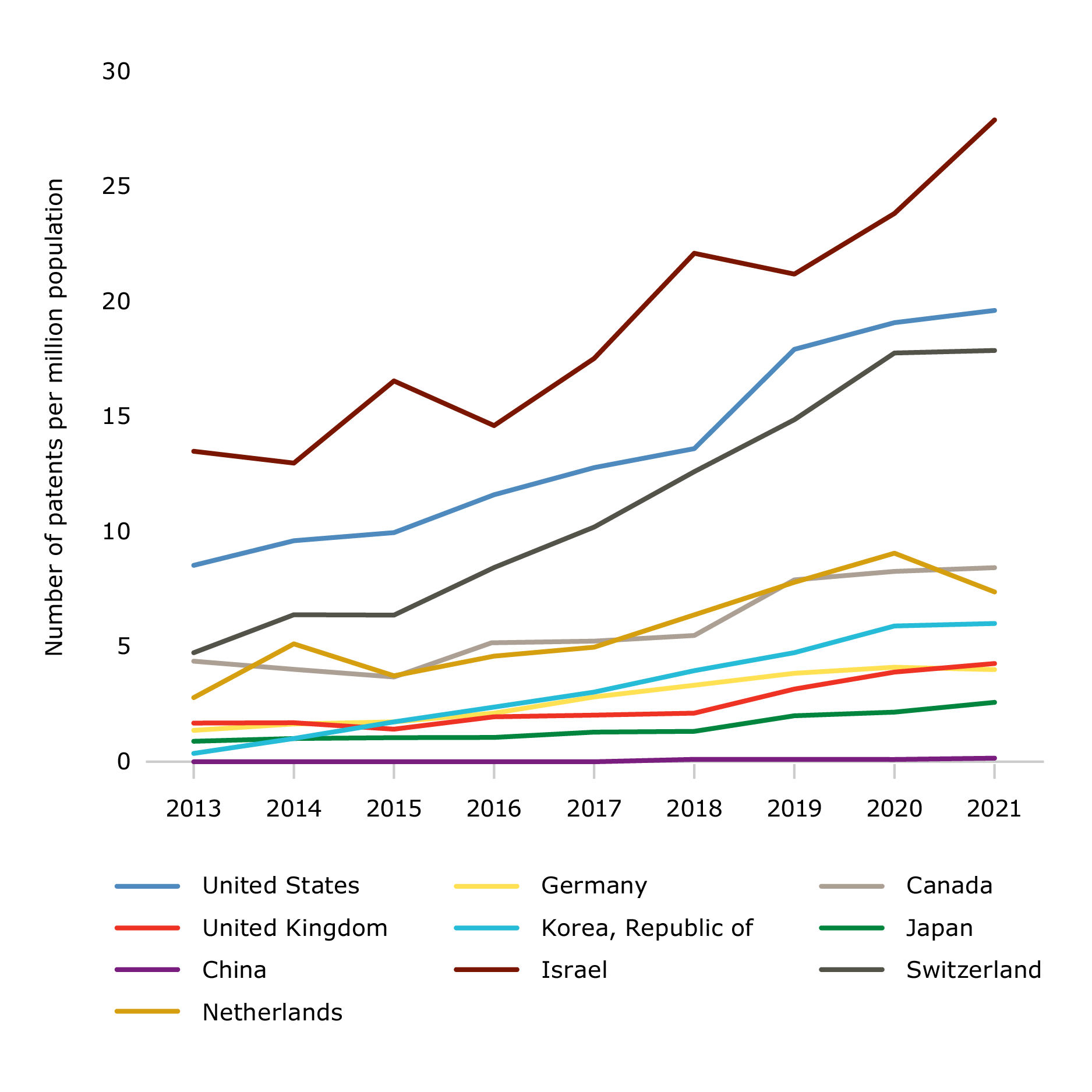 Figure 1: Patents granted by country of inventor per million population, 2013 to 2021