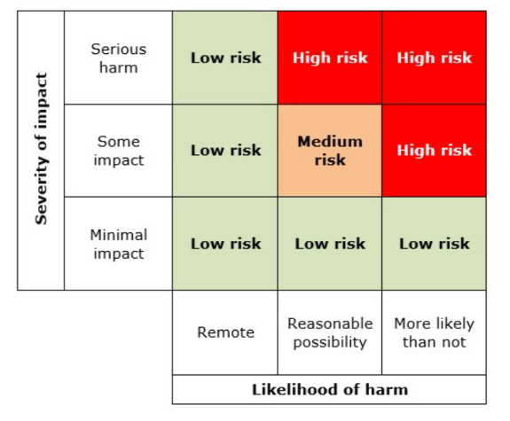 To assess whether the risk is a high risk, you need to consider both the likelihood and severity of the possible harm. Harm does not have to be inevitable to qualify as a risk or a high risk. It must be more than remote, but any significant possibility of very serious harm may still be enough to qualify as a high risk. Equally, a high probability of widespread but more minor harm may still count as high risk.