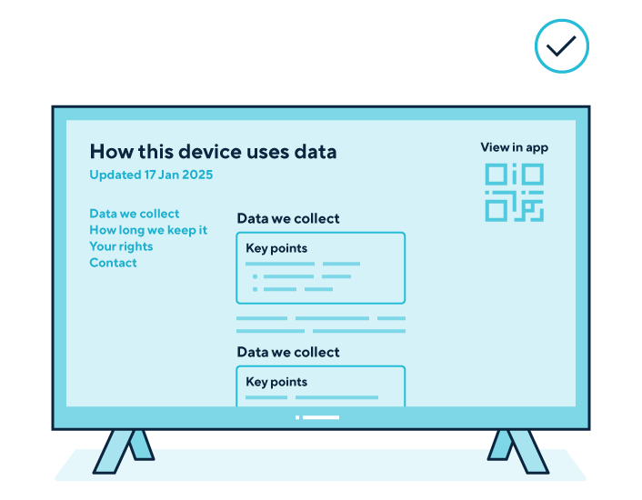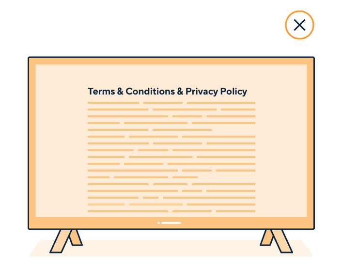 A graphic shows a smart TV displaying a privacy policy and terms and conditions. It bundles them in a large block of text without headings or navigational aids.