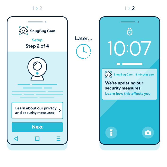 A graphic shows the set-up of a smart baby monitor. The users were shown a link to more information about the product’s privacy and security measures, which they could choose to interact with. A few weeks later, the baby monitor is due a security update that will change how some of the users’ personal information is processed. The users receive a notification on their mobile phone about the security update. They can navigate to a page that explains the changes.