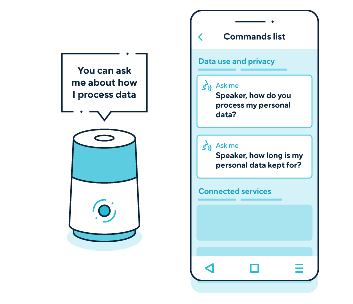 A graphic shows a smart speaker answering users’ questions about how their personal information is processed via its voice interface.