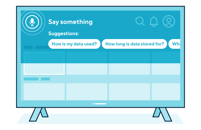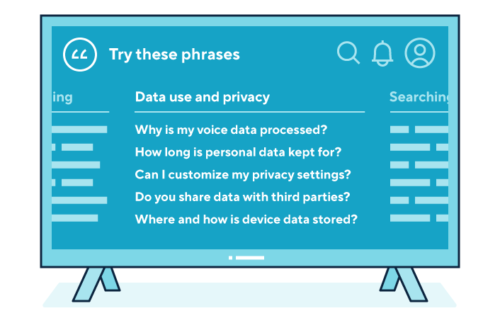 Two graphics show smart TVs using a smart assistant’s voice interface to provide privacy information about how users’ personal information is processed.