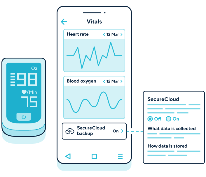A graphic shows a smart oximeter and its accompanying app displaying privacy information about the cloud back-up setting being on. After users click on the cloud setting, they are presented with more information about what data is collected and stored on the cloud. The oximeter doesn’t have an on-device screen that would allow it to show information in this way.