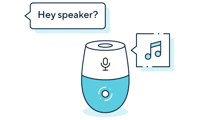 A graphic shows a smart speaker making a sound when it starts ‘listening’ after being prompted by a user.