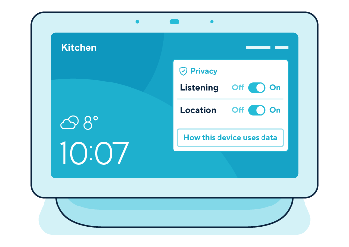 A graphic of a smart home hub shows a dashboard with privacy settings allowing any user, registered or unregistered, to manage controls for sharing certain personal information, including location and whether the home hub’s voice assistant is listening. Any user can access transparency information about how the home hub uses personal information.