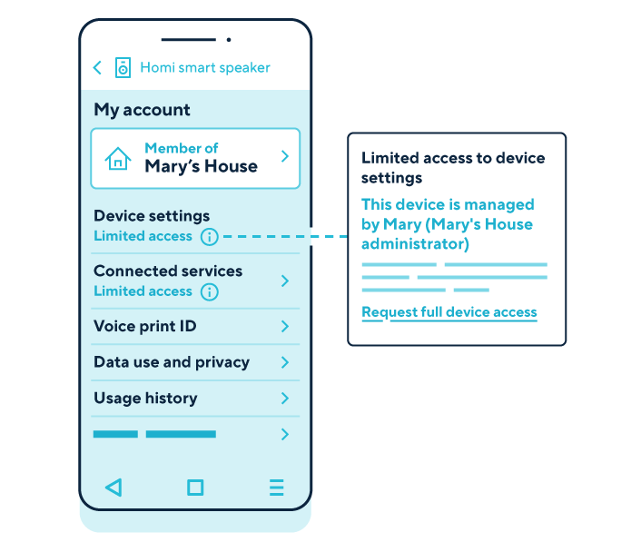 A graphic shows a smart speaker’s accompanying app indicating what product controls are available to an additional user. The additional user is made aware they have limited access to change device settings or to make decisions about what connected services they can control. They can manage their voice ID and view their usage history. They can also view information about how the smart speakers use personal information and privacy.